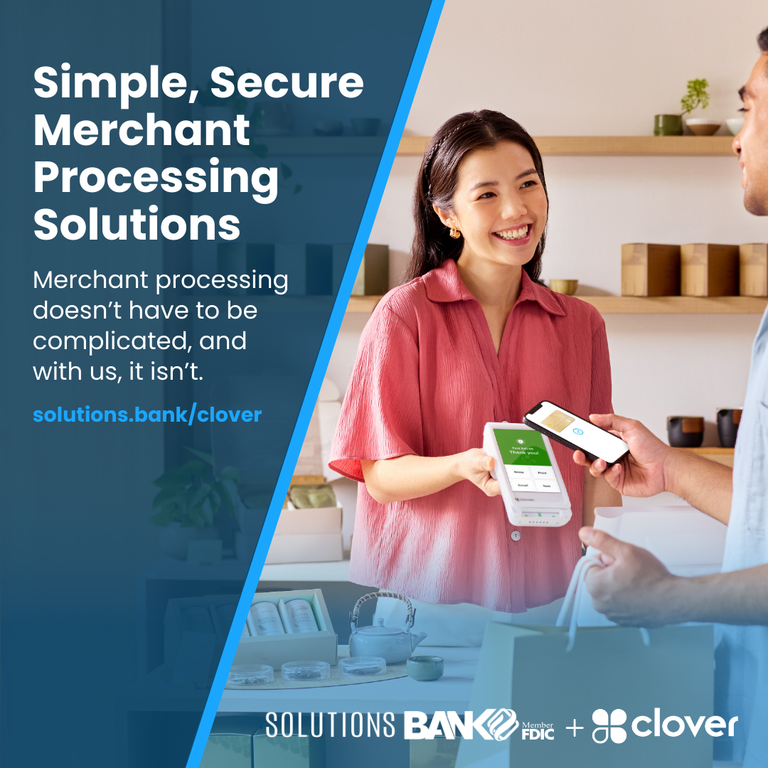 Merchant processing shouldn’t be a headache. That’s why Solutions Bank has partnered with Clover to offer straightforward, reliable payment solutions for local businesses. We invite you to bring in your merchant statements for a free, no-obligation review with our knowledgeable team. We’ll help identify hidden fees, break down your current costs, and show you how Clover’s secure, easy-to-use tools can simplify the way you accept payments.