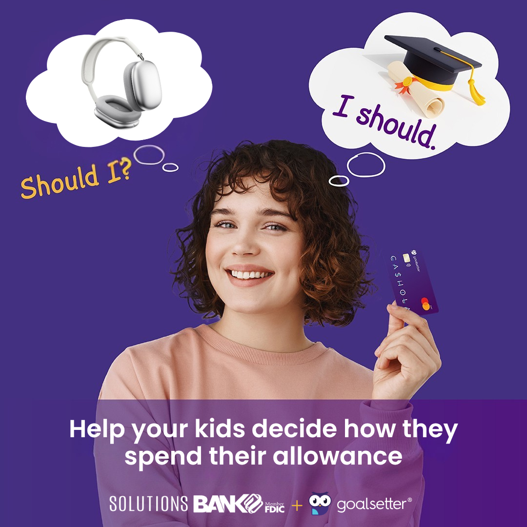 Tired of debit cards and apps that only teach kids how to spend? So are we. That’s why we’ve partnered with Goalsetter, a fun, family-friendly financial literacy app that helps kids and teens learn smart money habits. With Goalsetter, kids can set savings goals, take engaging financial literacy quizzes, and use a parent-controlled debit card designed to build confidence and responsibility. Best of all, Goalsetter is complimentary for Solutions Bank checking account holders.