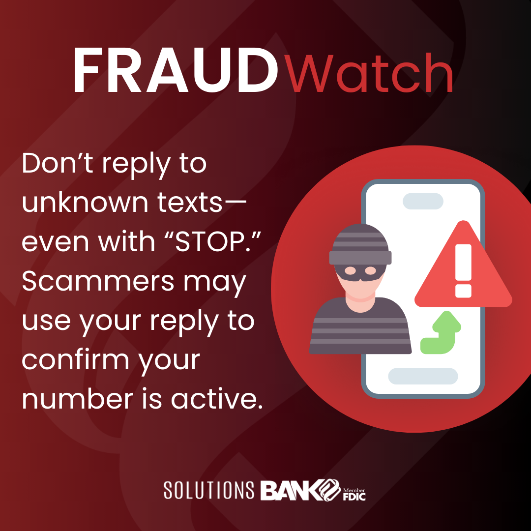 Don’t reply to unknown texts—even with “STOP.” Scammers may use your reply to confirm your number is active.